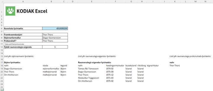Hlutafélagaskrá er ný viðbót við gagnaflóruna sem er í boði í KODIAK Excel. Með einföldum hætti er hægt að kalla fram framkvæmdastjórn, stjórnarmenn, stjórnarformann, prókúruhafa og raunverulega eigendur innan úr Excel.